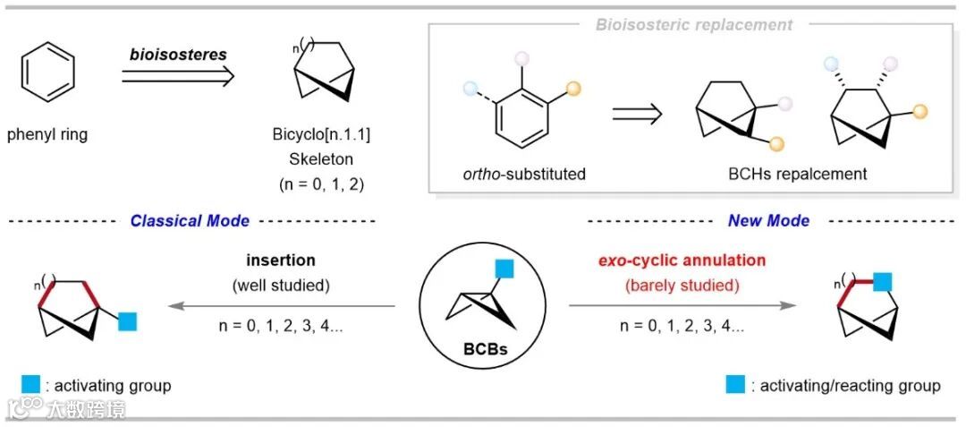 在该类骨架的构建中,通过“弹簧分子”双环[1.1.0]丁烷(BCB)的张力释放驱动扩环反应,已成为主流策略之一。然而,现有方法大多依赖于另一分子对BCB进行“插入”来实现扩环,BCB上的取代基主要作为σ桥键的活化基团,并未充分参与到后续的化学转化中。那么,能否充分利用BCB上取代基的活化作用与反应性,开发一种BCB扩环的新模式呢?