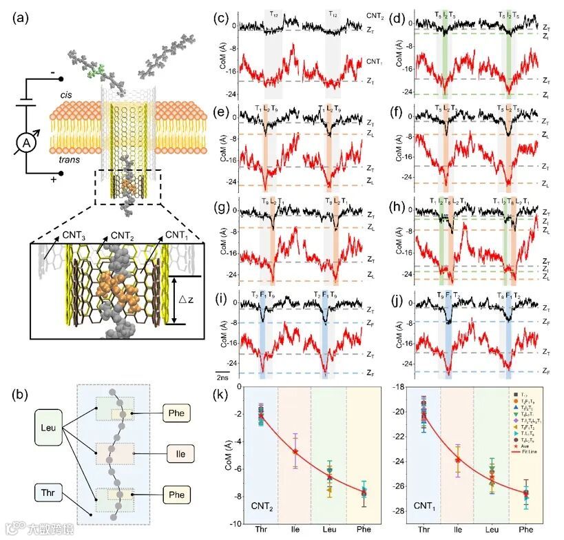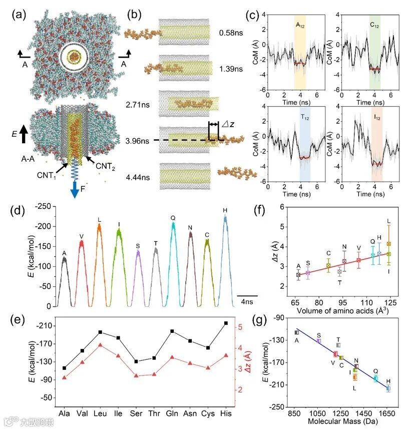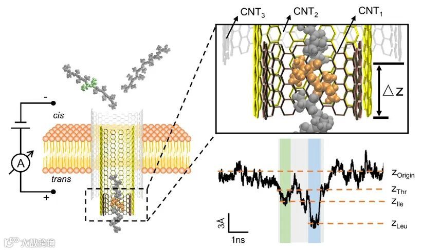 近日,东南大学司伟团队提出了一种多壁碳纳米管孔道传感系统(CNTPSS),用于识别蛋白质氨基酸以及在多肽链上的氨基酸位点。研究通过分子动力学模拟揭示了多肽与碳纳米管之间强范德华作用的机制,该作用是显著降低多肽转运速率的关键因素。当氨基酸残基穿过碳纳米管时,其不同侧链与管壁的相互作用表现出明显差异。得益于碳纳米管内壁光滑的管状结构,该系统能够将空间位阻效应与范德华力共同作为区分氨基酸的主要依据。结果显示,该多壁碳纳米管孔道传感系统不仅能够直接识别多达十种蛋白质氨基酸(尤其包括异构残基),还可以在亚纳米尺度上精确定位多肽链中单个氨基酸的替换位置,并识别特定位点的氨基酸变化。这些发现为实现高分辨率蛋白质测序提供了新的思路。