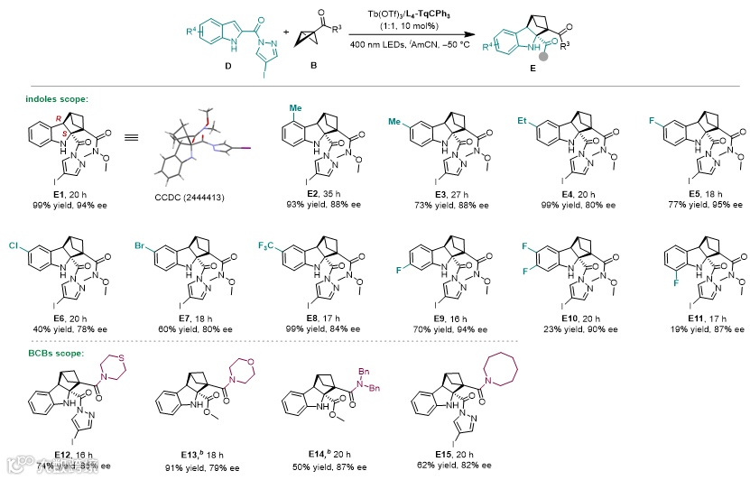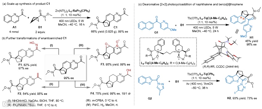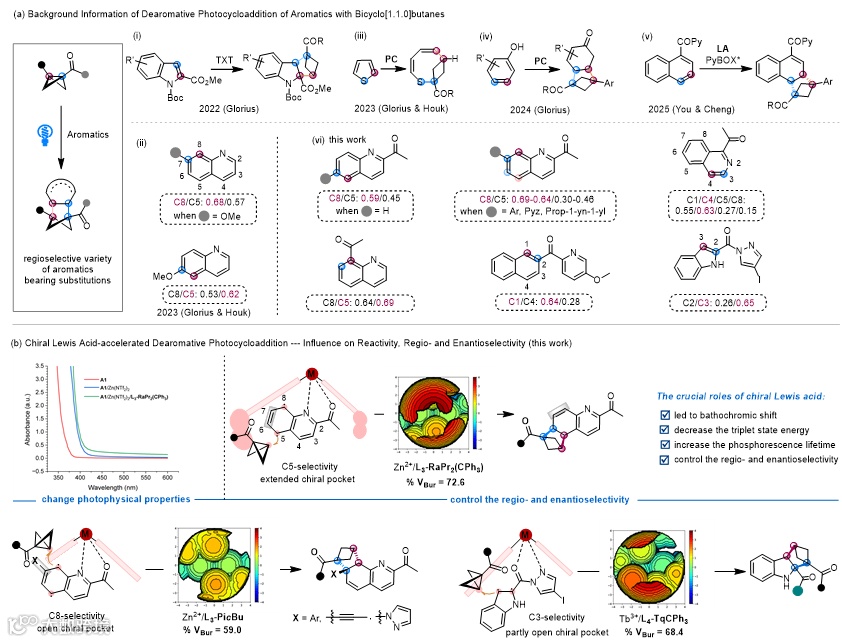 四川大学冯小明院士团队近年来在不对称光催化领域取得了一些重要进展。在光照条件下,手性双氮氧金属配合物(冯氏催化剂)能通过配位活化促进底物分子中碳-碳双键或碳-杂双键的直接激发,进而实现烯烃和(杂)芳环化合物的系列不对称催化转化(J. Am. Chem. Soc. 2022, 144, 22140; Angew. Chem. Int. Ed. 2022, 61, e202203374; J. Am. Chem. Soc. 2024, 146, 23457; Nat. Commun. 2024, 15, 10866; CCS Chem. 2025, 7, 573; Angew. Chem. Int. Ed. 2025, 64, e202500756)。近期,他们利用手性双氮氧/锌(II)配合物实现了可见光诱导喹啉、吲哚衍生物与双环[1.1.0]丁烷(BCB)的不对称去芳香化[2+2]环加成。结合底物取代基效应,通过对催化剂手性口袋的精准调控,以高的区域、非对映和对映选择性合成了一系列手性杂环稠合双环[2.1.1]丁烷化合物,上述体系还能拓展至异喹啉、萘、苯并噻吩等多类芳烃。