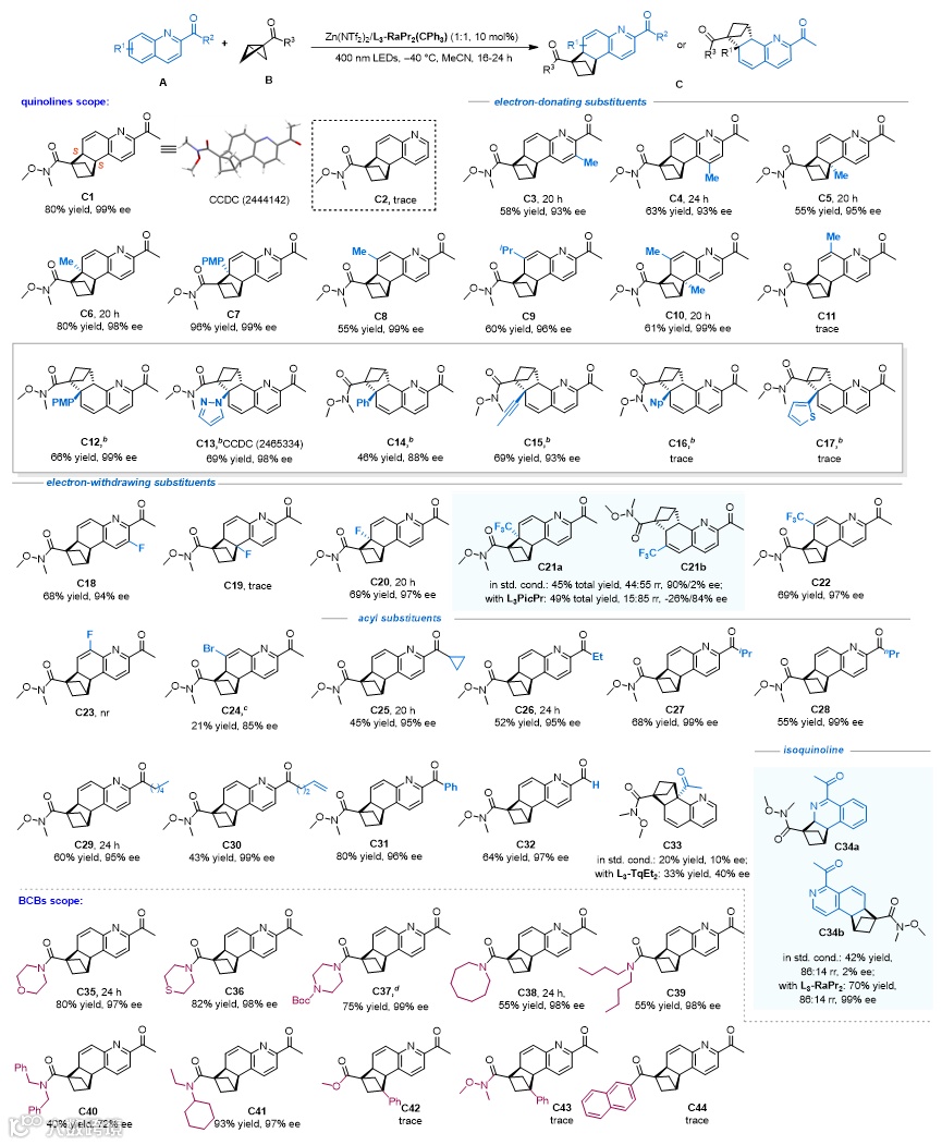 作者选用2-乙酰基喹啉与韦伯酰胺取代的BCB为标准底物,在确定最优条件后,考察了底物的普适性(图2,图3)。各类取代的喹啉、吲哚和双环丁烷都能得到不错的结果。值得提及的是,7-位富电子取代的喹啉得到C7-C8位反应的产物C12-C17。