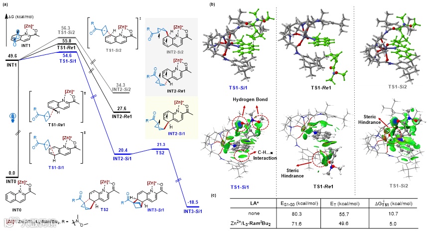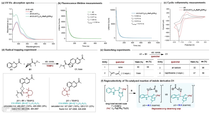 作者通过一系列控制实验和谱学研究(图5)证明反应经历双自由基中间体。结合DFT计算,提出了可能的反应机理(图6)。其中,Lewis酸配位能促进底物选择性激发生成双自由基,并能控制其后续反应的立体选择性。底物取代基与配体位阻共同影响反应区域选择性,催化剂中配体与底物间的C-H…π和氢键等弱相互作用对立体选择性控制至关重要。