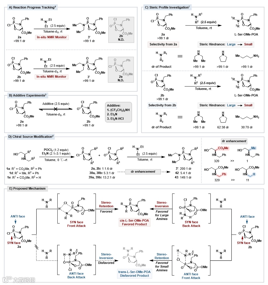 最后,作者对合成丝氨酸-磷酰胺过程中出现的立体选择性收敛现象进行了研究。最初,作者设想该立体选择性收敛是通过动态动力学拆分实现:顺式-反式中间体2a、2b之间存在相互转化,且仅有一个中间体转化为产物。然而,将中间体2a、2b分离,并分别投入标准反应后,作者发现2a/2b可以独立地生成标准产物3ʹ (>99:1 dr), 且另一个中间体2b/2a并未产生。这表明两个中间体之间并未发生互相转化 (图4A)。同时,三组模拟标准反应条件的添加剂实验也证明了该相互转化并不存在 (图4B)。随后,作者选取了三种位阻不同的胺,对单一构型的中间体2a/2b分别进行亲核取代反应。结果表明,顺式-2a总是得到顺式-膦酰胺产物 (>99:1 dr)。反式-2b在使用大位阻胺的时候可以得到顺式-磷酰胺产物 (>99:1 dr),而随着胺的位阻变小,反式-磷酰胺产物的比例逐渐上升 (62:28 dr – 30:70 dr)。该实验证明两个中间体存在各自不同的亲核取代机制 (图4C)。最后,作者对所使用的N-苄基-丝氨酸甲酯 (1a) 的结构进行了改造和研究。通过将羧酸甲酯替换为甲基 (1d) 后,可以制备一对磷酰氯中间体38a、38b (5.3:1 dr)。然而,其与二乙基胺反应后所得到的磷酰胺产物40的立体选择性并未变化 (5.4:1 dr),这说明1a骨架上的的酯基对立体选择性收敛有着决定性的作用。另一方面,通过将N-苄基替换为N-甲基 (1e) 后,可以制备另一对磷酰氯中间体39a、39b (13.2:1 dr),与二乙基胺反应后所得到的磷酰胺产物41的立体选择性有所提升 (149:1 dr),但仍然低于标准产物3ʹ (200:1 dr)。将中间体2a/2b和39a/39b转化为膦酰胺产物3ʹ和41过程中dr值升高的幅度互相对比,可以发现1a的立体选择性收敛的幅度更大,这说明N-取代基的位阻对立体选择性收敛也有影响 (图4D)。综合实验结果,作者认为顺式-反式中间体2a、2b在胺解过程中发生了不同的亲核取代反应机制,对于顺式-2a,胺亲核试剂永远从氯原子的正面进攻,得到立体构型保持的顺式-膦酰胺产物;而对于反式-2b,大位阻胺亲核试剂同时受到丝氨酸骨架上的酯基的氢键作用,以及N-苄基的位阻效应,从氯原子的反面进攻,得到立体构型反转的顺式-膦酰胺产物;小位阻胺亲核试剂由于体积较小,其进攻的方向会偏向从氯原子的正面进攻,得到立体构型保持的反式-膦酰胺产物 (图4E)。