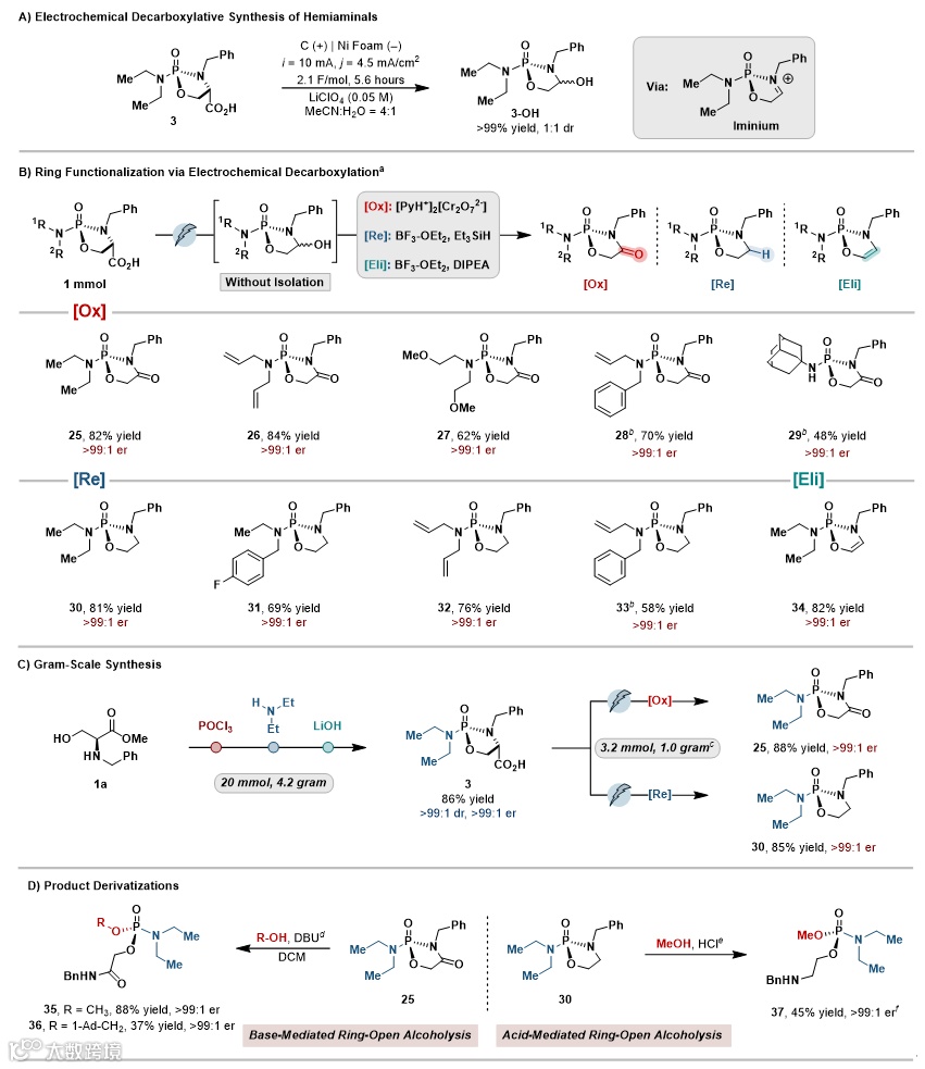 在完成丝氨酸-磷酰胺的合成后,作者设想,该系列产物的含磷杂环可以通过电化学脱羧反应进行进一步改造与拓展。结合传统的Hofer–Moest电化学脱羧反应与近几年电化学脱羧反应的研究进展 (例:Nature, 2019, 573, 398; OL, 2019, 21, 9262),经过条件筛选发现,以丝氨酸-磷酰胺3作为底物,使用石墨电极作为阳极,泡沫镍电极作为阴极,在乙腈与水的混合溶液中以恒定电流 (10.0 mA) 进行电解,在通过2.1 F/mol的电量后,可以高效地将底物转化为半缩醛胺3-OH (99% yield, 1:1 dr) (图3A)。