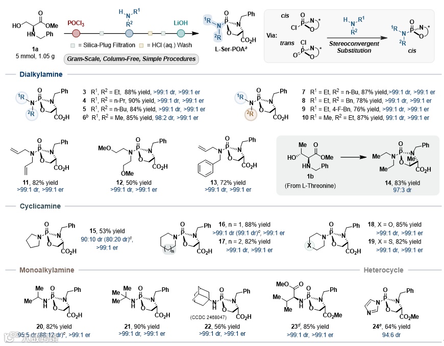 为了研究这一合成方法,作者选取了商业可得且极易合成的N-苄基-L-丝氨酸甲酯 (1a) 作为氨基醇底物进行探索。作者发现,通过将1a与三氯氧磷 (POCl3) 进行缩合,可以高效地制备一对互为顺式-反式结构的丝氨酸甲酯-膦酰氯非对映异构体 (L-Ser-POCls-2a, 2b),但选择性极低 (94% yield,2a:2b = 1:1.6 dr)。然而,将这对非对映异构体的混合物与过量的二乙胺亲核试剂进行反应时,作者意外地发现,该胺解反应高效地生成了目标产物,且为单一非对映异构体:丝氨酸甲酯-膦酰胺3ʹ (90% yield, >99:1 dr, >99:1 er)。随后,通过氢氧化锂水解,以近乎当量的收率得到了对应的丝氨酸-膦酰胺3,立体选择性保持不变 (>99:1 dr, >99:1 er),由晶体结构确定了产物为顺式结构。值得注意的是,具有单一的立体选择性 (>99:1 dr)的顺式产物3ʹ是从一对接近等比例 (1:1.6 dr) 的顺式-反式中间体2a、2b转化而来的,这说明在胺解的过程中,发生了立体选择性收敛,使顺式-反式的中间体全部转化为顺式的产物。这样的立体选择性收敛过程在以往的手性P(V)化合物的合成中未见报道 (图1C)。