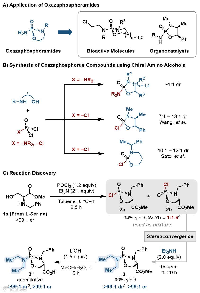 具有磷-手性中心的五价磷化合物 (简称: P(V)化合物) 在有机化学、农药化学、药物化学中具有非常重要的作用。其中,具有磷-杂原子结构的P(V)化合物 (P(O)-N/O/S) 在生物活性分子、抗癌药物、杀虫剂中非常常见。在过去的几年中,这类分子的不对称合成方法取得了巨大的进展,主要包括过渡金属催化、有机催化、手性助剂三种方法。特别是最近的一年中,诸多课题组陆续发表了各具特色的手性P(V)化合物的合成方法 (例: JACS, 2024, 146, 31339; ACIE, 2024, 63, e202400673; Nature, 2024, 632, 1052; JACS, 2024, 146, 33763; JACS, 2025, 147, 11010; Chem, 2025, 11, 102586; JACS, 2025, 147, 21339; ACIE, 2025, 64, e202510513; ACIE, 2025, 64, e202509807)。然而,在所有P(V)化合物中,一类具有环状氧氮杂-膦酰胺结构的P(V)化合物的合成方法仍然十分有限,大多数依赖于手性氨基醇与三氯氧磷或二氯膦酰胺的缩合反应。这些方法通常先得到一对选择性较低的非对映异构体 (~1:1 dr),随后经过拆分的方法得到手性P(V)化合物。这导致此类合成方法的效率往往偏低。虽然一些特定的手性氨基醇可以得到一定的选择性 (7:1-13:1 dr),但由于其骨架缺乏容易转化的官能团,无法实现对产物的含磷杂环的后续改造 (图1A-B)。