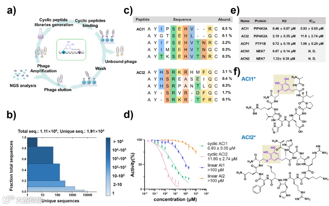 在验证环化平台可行性的基础上,作者针对磷脂酰肌醇-5-磷酸4-激酶2α(PIP4K2A)、蛋白酪氨酸磷酸酶1B(PTP1B)和NIMA相关激酶7(NEK7)等多个治疗相关靶点开展了亲和筛选。高通量测序与结合实验表明,从环肽库中富集得到的多株克隆具有高亲和力,其中环肽ACI1对PIP4K2A的Kd为0.46 µM,IC50达0.93 µM;环肽ACP1对PTP1B的Kd为0.72 µM,IC50为1.06 µM,且其线性前体活性显著下降,凸显环化对提升结合与抑制能力的关键作用。