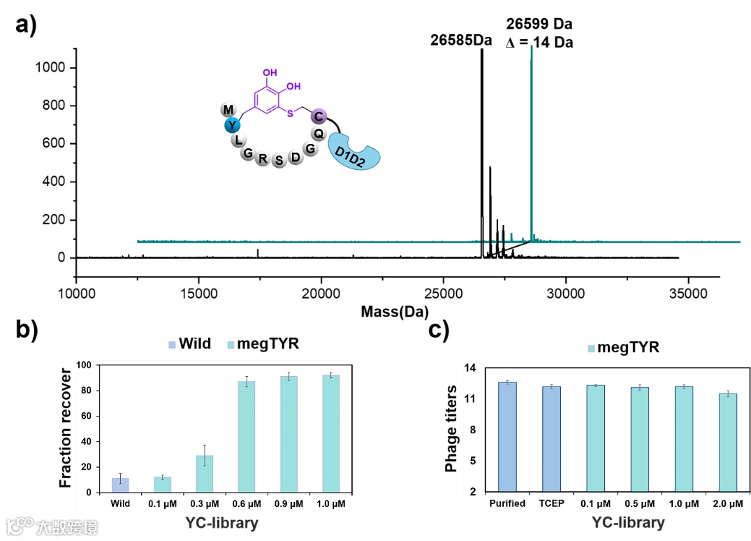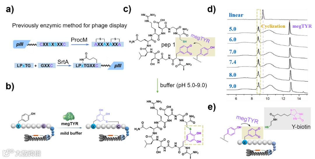图1. 酪氨酸酶介导的成环反应用于噬菌体环肽文库的构建