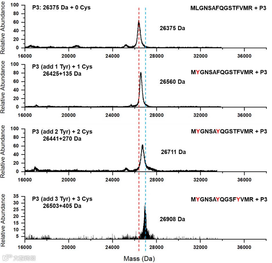 为阐明酶的空间选择性,该课题组设计了一系列在pIII蛋白展示区含不同数目外源酪氨酸的噬菌体突变体,经酪氨酸酶处理后进行了精确的质量分析。结果显示,酶促反应导致的分子量增加与外源酪氨酸的数量严格呈正相关:每多一个可被催化氧化的酪氨酸,其分子量增加幅度与理论计算一致(符合醌-半胱氨酸加成产物的预期增重),而野生型pIII蛋白(不含外源酪氨酸)则未检测到明显的质量变化。这一结果直接证明,酪氨酸酶仅作用于外源引入的、高可及性的酪氨酸,而不识别pIII蛋白自身结构中原有的酪氨酸残基,排除了非特异性修饰的可能。同时,共聚焦显微镜分析显示,野生型噬菌体样本中观测不到绿色荧光信号,而突变噬菌体则形成明显的聚集荧光斑点,直观证实了酪氨酸酶的选择性催化活性仅发生于外源展示肽区域。