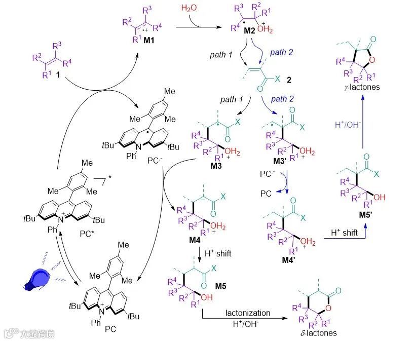 基于机理实验结果及文献报道,作者提出了该反应的一种合理机理(图5)。首先,在可见光照射下,光催化剂(PC)生成激发态光催化剂(PC*)。PC*通过单电子转移(SET)被烯烃1淬灭,生成还原态光催化剂PC•-物种和阳离子自由基中间体M1。随后,M1被水(H2O)淬灭并发生SN1进攻,经C-O键形成生成烷基自由基中间体M2。区域选择性由更稳定的烷基自由基的生成主导。在缺电子烯烃2存在的情况下,M2发生自由基加成,生成新的烷基自由基中间体。就自由基对烯烃部分的加成区域选择性而言,反应存在两个可能的位点。加成至缺电子烯烃2的β位(路径1)生成中间体M3,加成至缺电子烯烃2的α位(路径2)生成中间体M3',呈现出自由基加成的区域发散性。接着,碳中心自由基(M3或M3')被还原态光催化剂(PC•-)进一步还原,生成碳负离子中间体(M4或M4'),同时再生光催化剂(PC)。最后,碳负离子的质子化生成中间体(M5或M5'),随后在酸性或碱性条件下经热力学有利的分子内内酯化反应,生成目标产物δ-和γ-内酯。