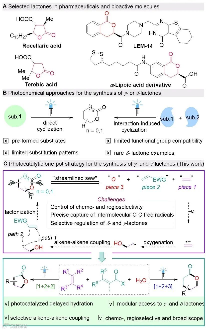 γ-内酯和δ-内酯广泛存在于药物、天然产物、药物候选物和有机材料中。例如,γ-和δ-内酯衍生物可用作传粉引诱剂和种子萌发刺激剂、信息素、防腐剂、强心剂、食品添加剂和香料。此外,γ-和δ-内酯是获取其它官能团及合成高附加值目标物的宝贵前体。鉴于γ-和δ-内酯的普遍性及其重要性,化学家们投入了大量努力开发其高效合成方法。传统γ-和δ-内酯合成方法包括预合成羟基酸的分子内酯化、环酮的拜耳-维利格氧化、烯酮的异构-Diels-Alder反应、迈克尔加成/内酯化级联反应以及金属和有机催化策略。然而,传统方法通常依赖于复杂的起始原料和/或多步反应,仅能合成具有有限取代模式的内酯。过去几十年间,光催化的复兴为通过单电子转移途径在温和条件下实现一系列具有挑战性的反应提供了可行平台。