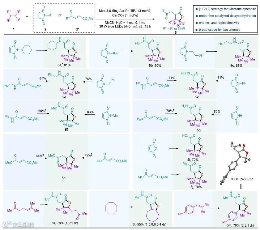 鉴于烯烃的光催化延迟水化已实现[1+2+3]内酯化以合成δ-内酯,作者设想进一步将此策略扩展至弱极化和非极化的缺电子烯烃。此类烯烃由于碳碳双键极性较低而更具挑战性,可能引发[1+2+2]过程以生成热力学更有利的五元环γ-内酯。因此,作者探索了一系列在烯烃1,2位带有两个吸电子基团的缺电子烯烃(图3)。N-取代马来酰亚胺在水存在下与四甲基乙烯反应,以76%-90%的产率生成相应的γ-内酯。未取代的马来酰亚胺也可发生期望反应,以80%的产率生成γ-内酯。有趣的是,3位带有酯基的非环丙烯酰胺顺利反应,以60%-71%的产率生成相应的γ-内酯。值得注意的是,马来酸二甲酯和富马酸单甲酯也适用于该反应,分别以64%和75%的产率生成相应的γ-内酯。此外,马来酸酐也是一种合适的底物,可顺利反应生成相应产物,产率为72%。此外,乙酰乙酸甲酯具有良好的耐受性,以70%的产率生成相应的γ-内酯。三取代和二取代脂肪族烯烃分别有效转化为相应的γ-内酯,产率分别为78%和55%。此外,苯乙烯作为反应的有效底物,可生成期望的γ-内酯,产率为70%。