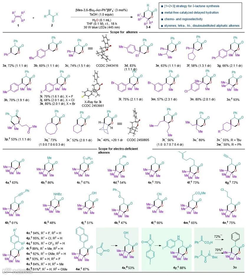经过条件筛选得到最优反应条件后,作者首先考察了在水存在下,通过有机光催化[1+2+3]策略合成δ-内酯的底物范围(图2)。首先,作者考察了电中性烯烃的适用范围。含有广泛官能团且具有多样取代模式的中性烯烃均能很好地耐受该反应。1-取代苯乙烯是该反应的良好底物,可与2-苯基丙烯酸酯反应生成3,5-二取代δ-内酯,产率分别为72%和60%。接下来,在最优反应条件下,广泛范围的1,1-二取代苯乙烯均可相容,以良好产率得到目标δ-内酯产物。1-甲基、乙基、异丙基和环戊基取代的苯乙烯均能顺利转化为相应的3,5,5-三取代δ-内酯,表明取代基的空间位阻增加对反应影响较小。此外,测试了多种带有给电子或吸电子基团的1,2,2-三取代苯乙烯,发现它们在反应中均能耐受,并以66%-80%的产率得到目标δ-内酯产物。另外,1,2-二取代苯乙烯也可参与反应,以57%的产率得到目标δ-内酯。值得注意的是,1,1,2-三取代苯乙烯也适用于该内酯化反应,以80%的产率得到相应内酯。令作者欣喜的是,具有不同取代模式的内烯烃和末端脂肪族烯烃均证明是该反应的合适底物,以中等至良好产率得到相应δ-内酯。四取代和三取代脂肪族烯烃成功转化为相应δ-内酯,产率分别为93%和53%。