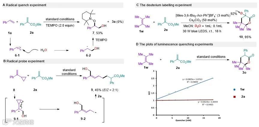 为探究反应机理,作者开展了一系列对照实验,如图4所示。首先,在标准条件下,在自由基清除剂2,2,6,6-四甲基哌啶氧基(TEMPO)存在下,对1a和2a进行了反应。期望得到的[1+2+3]环化产物3a的生成被抑制,相反,得到了TEMPO加成物7,产率为53%。该结果表明反应中存在苄基自由基6-2作为中间体,该中间体由阳离子自由基6-1经水淬灭生成。为进一步证明反应的自由基特性,在标准条件下使用α-环丙基苯乙烯8与2a进行自由基时钟反应。得到了加成/开环加成物9,产率为45%,进一步表明反应具有自由基特性,即生成苄基自由基(9-1),随后环丙烷开环生成烷基自由基中间体(9-2),该中间体可被自由基受体2a捕获。为进一步理解反应的质子化机理,在标准条件下使用1w和2a在D2O存在下进行了氘标记实验。在苄基位点实现了92%的氘掺入,期望的偶联-环化产物10以95%的产率获得,表明形成了苄基碳负离子。此外,在标准条件下使用1w和2a进行了荧光猝灭实验,以探究反应的起始步骤。结果发现,烯烃1u对光催化剂(Mes-3,6-t-Bu2-Acr-Ph+BF4-)的激发态表现出显著的猝灭效应,表明光催化循环可能由烯烃对光催化剂激发态的还原猝灭引发。