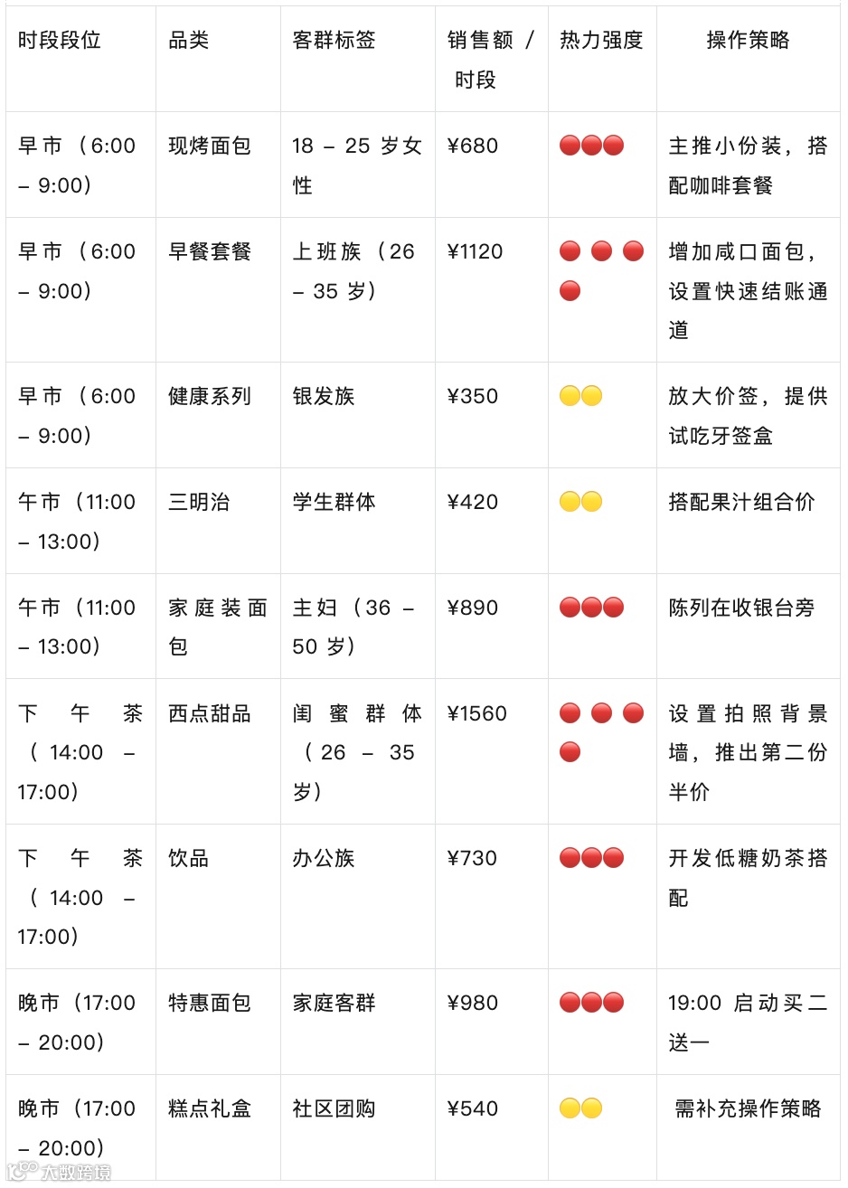 推出"家庭烘焙卡":预付299元享全年新品6折、生日蛋糕免费升级、每月1次亲子课程59;再比如建立"晨练银发计划":7:00-8:30时段,60岁以上顾客凭身份证享全场8折。