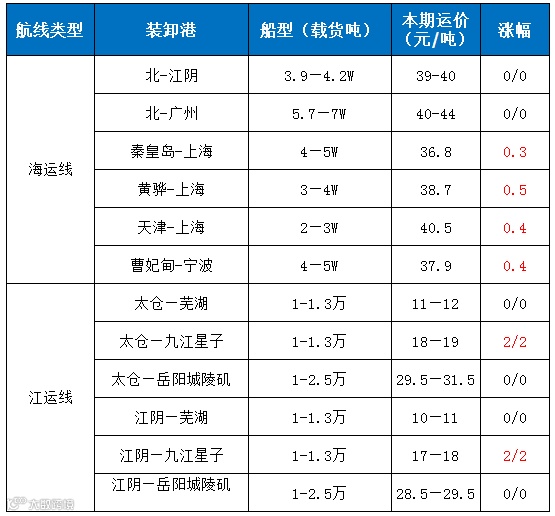 周日货盘有所减少,价格主导权逐渐向货主偏移,虽然船东挺价但是海运价格稳中向弱;受到长江上游强降水影响,船舶运输成本增加,今日江运价格继续上涨。
