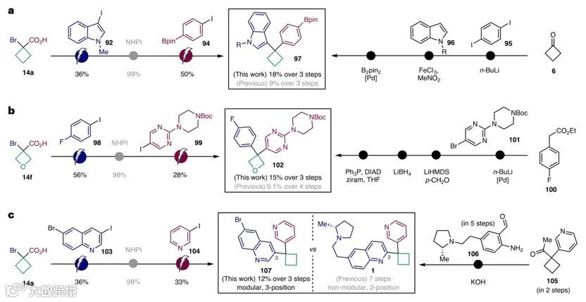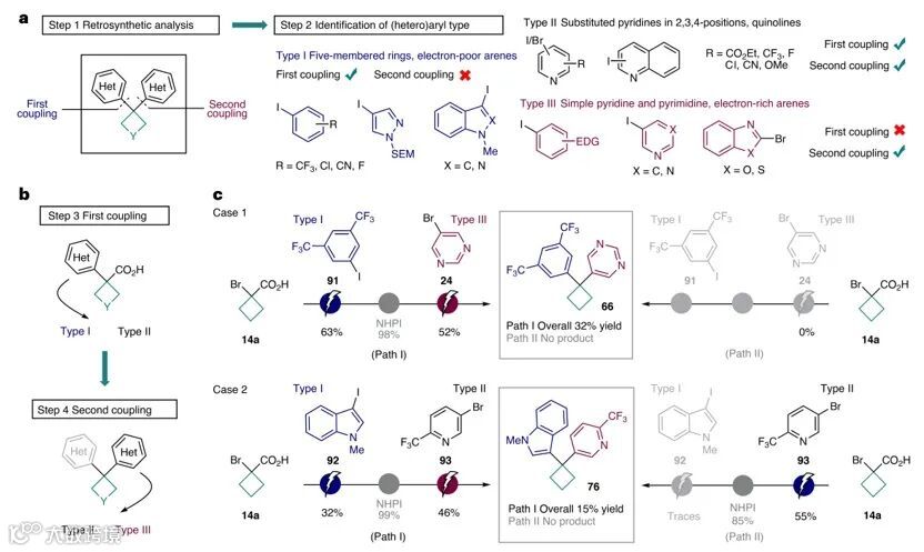 随后,作者制定了分步图形指南指导优选的偶联次序(图5),具体而言:对目标偕-1,1-二芳基化四元环进行逆合成分析(step 1),然后分别评估两种(杂)芳基卤化物(step 2)并按反应活性分为三类(图5a):即type I(五元环(如:吲哚、吲唑和吡咯)和缺电子芳烃,适用于首次偶联)、type II(适用于两种偶联的取代吡啶)和type III(未取代吡啶、嘧啶和富电子芳烃,适用于第二次偶联)。最后,在step 3和4中使用这些指南规划合成路线(图5b)。如图5c所示,化合物66可以逆合成分解为1-溴环丁烷甲酸14a、1-碘-3,5-双(三氟甲基)苯91(type I)和5-溴嘧啶24(type III)。根据指南,首先偶联杂芳烃91(type I),然后再偶联24(type III),从而以32%的总产率得到化合物66(path I)。相反,由于24与14a的第一次偶联无法进行,因此反转优选偶联顺序(path II)以失败告终。类似地,化合物76可以逆合成分解为α-溴酸14a、N-甲基取代碘吲哚92(type I)和5-溴-2-三氟甲基吡啶93(type II)。遵循指南,path I以15%的总产率获得所需化合物76;而path II能以55%的产率实现14a与II型芳基卤化物93的偶联,但是所得的叔酸却无法与芳基卤化物92(I型)进行偶联。