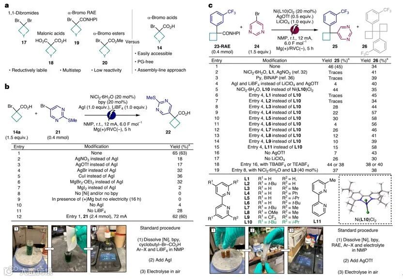 首先,实现连续偕二芳基化反应需要解决两个基本问题:1)找到一种易制备、储存稳定并适用于逐步交叉偶联的偕二取代前体;2)开发一种将所得叔苄基体系偶联形成所需偕二芳基化季铵盐中心的方法。为了应对第一个挑战,作者评估了一系列偶联试剂(如:偕二溴环丁烷(17)、丙二酸衍生物(18)、α-溴RAE(19)、α-溴酯(20)等,图2a),发现廉价易得的α-溴酸(14)与21在优化条件下能以65%的产率获得所需的单芳基酸22(图2b),并且该反应能以2.4 mmol规模进行制备(产率:60%)。另外,对照实验表明镍催化剂、配体、电流、AgI和LiBF4对于该反应至关重要。随后,作者对市售酸23的现成RAE进行了第二次芳基化评估(图2c),结果显示23-RAE 与5-溴嘧啶24进行反应时能以46%的产率获得1,1-二芳基化产物25,同时还伴随着由23-RAE还原产生的瞬态自由基二聚引起的双环丁烷26(产率:34%)。当23-RAE在单芳基化条件下进行反应时仅得到4%的25,进一步筛选表明配体对于实现这种苛刻的转化至关重要,其中L10被鉴定为唯一合适的配体。为了方便和可重复性,作者使用Ni(L10)Cl2预催化剂;但是分别加入配体和镍前体时也得到了类似的产率(44%)。总体而言,上述顺序芳基化程序非常相似,仅在银盐、电解质和配体方面有所不同。