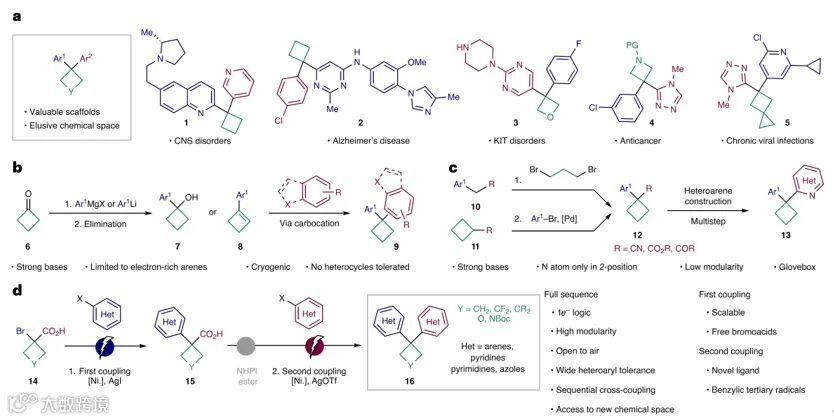 含有张力四元环的分子骨架能被用于调节候选药物的药代动力学和药效学特征,从而提高溶解度、增强代谢稳定性并改善受体和配体之间的相互作用,在药物化学中受到广泛关注。特别是环丁烷、氮杂环丁烷和氧杂环丁烷,它们已被证明分别是芳环、哌啶和羰基化合物的生物电子等排体。对专利文献的调研表明,偕(1,1)-二芳基取代的四元环具有更高的价值(图1a),但它们的合成方法却跟不上药物发现的要求,多依靠受限严重的逐步双电子方法(图1b)。例如,合成1,1-二芳基环丁烷的传统方法中,Lewis酸促进的Friedel–Crafts反应(7)存在开环和重排等问题,而环丁烯(8)的过渡金属催化的芳基化和Brønsted酸催化的氢芳基化也仅限于安装富电子芳烃,底物范围和官能团兼容性有限。目前,化学家经常依赖羰基烯醇化和将所得羧基/氰基官能团转化为杂芳烃的缩合化学来制备这些化合物(图1c),但是化学选择性问题、双烯醇化烷基化产率低、官能团耐受性差以及需要严格无水无氧等条件限制了其应用,导致第二个芳基的构建主要局限于氮基杂环的2-位,这极大地限制了多样性空间并且通常涉及多步序列,同时条件各异,不利于不同环体系的平行筛选。