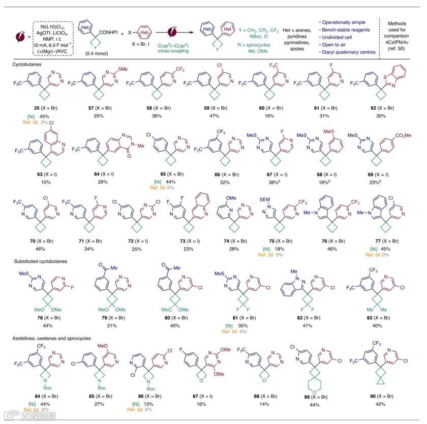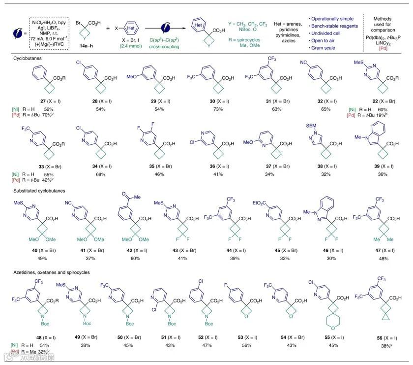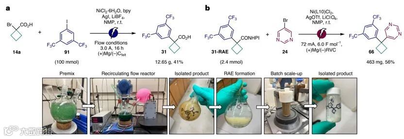 Phil S. Baran教授团队利用一系列连续的镍-电催化交叉偶联,成功实现了α-溴代酸的两次顺序C-C偶联反应并构建了一系列1,1-二芳基环丁烷、氮杂环丁烷和氧杂环丁烷。该方法已在Pfizer、Biogen、Abbvie 和BMS等多个药物研发项目中得到验证。与传统的钯催化或光化学方法相比,该方法具有互补性和显著优势。此外,该方法的规模化合成前景已获证实,并配套开发了用户指南,便于快速推广使用。