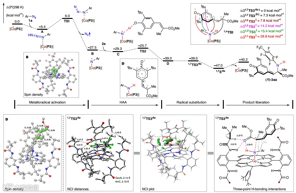 接下来,作者采用密度泛函理论(DFT)计算详细研究了[Co(P3)]催化乙烯基苯酚2a与叠氮化物1a进行不对称去芳构化共轭胺化的催化路径和相关能量学(图4)。具体而言:叠氮化物1a与[Co(P3)]通过金属配位和多重氢键相互作用结合并形成中间体A,再通过TS1的自旋转位均裂活化叠氮化物1a并生成α-Co(III)-氨基自由基中间体B(大部分自旋密度从钴中心转移到氮原子),同时释放出副产物氮气。该金属自由基活化过程是放热的(22.1 kcal mol−1),由于其活化能垒相对较高但易于接近,因此被认定为决速步。随后,α-Co(III)-氨基自由基B与乙烯基苯酚2a通过非共价相互作用(NCIs)结合并形成中间体C,其经TS2进行动力学上容易且热力学上有利的HAA并生成∞-Co(III)-amido苯氧基自由基中间体D(自旋密度在对乙烯基苯氧基单元的大π共轭体系广泛离域),D通过1,7TS3Re在酯官能团的α-位进行自由基取代,该过程几乎无能垒且放热8.0 kcal mol−1,从而形成1,7-胺化产物(R)-3aa。其次,计算显示在其它可能位点进行自由基取代的过渡态1,nTS3的活化能垒明显高于1,7TS3Re,这与实验观察到的特异性1,7-胺化的区域选择性相一致。值得一提的是,对乙烯基苯氧基自由基中C=O基团与Co(III)-amido络合物中N-H、C-H和N-H基团之间独特的三点氢键相互作用(由D2对称手性amido卟啉P3支持)在稳定过渡态、引导区域选择性和确保催化过程中的对映选择性方面起着至关重要的作用。