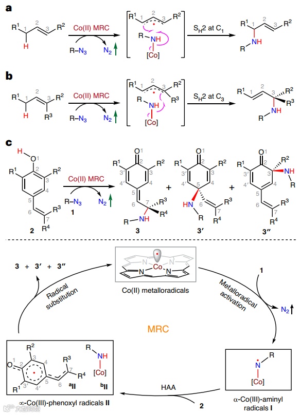 在过去的十数年里,涉及有机自由基作为中间体的新合成方法发展迅速,但是如何控制自由基反应的选择性(包括化学选择性、区域选择性、对映选择性)始终是不小的挑战。其中,离域自由基体系的区域选择性控制尤为困难,并且此前研究多聚焦于烯丙基自由基等简单离域体系,而更复杂、更大范围的离域自由基(如:含π共轭结构的苯氧自由基)的选择性调控尚未突破。另一方面,金属自由基催化(metalloradical catalysis,MRC)已成为控制均裂自由基反应的反应性和选择性的通用方法,开壳层金属配合物中的金属中心自由基作为单电子催化剂对底物进行均裂活化并生成金属结合的有机自由基,从而调控反应路径和立体化学。目前,化学家以模块化设计的D2-对称手性酰胺卟啉(D2-Por*)为多功能配体平台,通过Co(II)-MRC实现了1,2-二取代烯烃与芳基叠氮化物的直接烯丙基C-H键胺化反应(图1a),甚至还能以不错的非对映/对映选择性实现三取代烯烃与芳基叠氮化物的不对称自由基1,3-共轭烯丙基C-H键胺化反应(图1b)。
