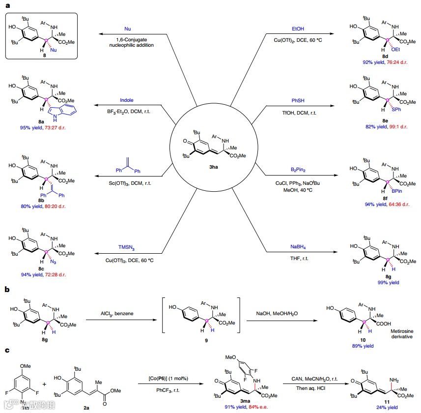 最后,作者进行了一系列合成应用,具体而言:1)α-叔氨基酯3ha可作为一个多功能构建砌块,与多种亲核试剂(如:吲哚、1,1-二苯基乙烯、TMSN3、乙醇、PhSH、B2(pin)2、NaBH4)进行1,6-共轭加成反应(图6a),以较好的产率和中等至较好的非对映选择性获得具有相邻立体中心的手性氨基酯8a-8g;2)α-叔氨基酯8g中苯酚单元的两个邻叔丁基可以通过AlCl3介导的脱叔丁基反应轻松脱除,从而得到α-甲基酪氨酸甲酯9(图6b),无需进一步纯化,直接水解便可得到酪氨酸羟化酶抑制剂——甲酪氨酸衍生物10(两步总产率:89%);3)乙烯基苯酚2a与2,6-二氟-4-甲氧基苯基叠氮化物(1m)经[Co(P6)]催化的1,7-共轭胺化,以91%的产率、84% e.e.值合成了N-芳基氨基酯3ma(图6c),再经硝酸铈铵氧化和原位酸水解便可得到未保护的α-叔伯氨基酯11,尽管产率较低(24%)。