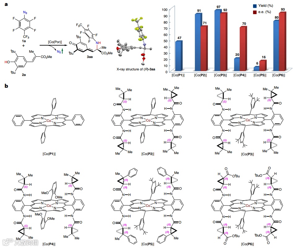 近日,美国波士顿学院的张小祥(X. Peter Zhang)教授课题组通过配体设计(D2-Por*),成功实现了Co(II)催化4-乙烯基苯酚与有机叠氮化物的对映选择性去芳构化1,7-共轭胺化反应(图1c),以高产率、高对映选择性构建了一系列含有四取代立体中心的手性α-叔氨基酸衍生物,这些化合物还可以进行许多立体特异性转化。具体过程如下:首先,Co(II)金属自由基活化有机叠氮化物1并生成α-Co(III)-氨基自由基I,I可以攫取4-乙烯基苯酚2中O-H键上的氢原子(HAA)并生成∞-Co(III)-氨基苯氧基自由基中间体II(包括离域对乙烯基苯氧基自由基aII和Co(III)-氨基复合物bII),最后经自由基取代便可形成所需产物。此外,计算和实验研究阐明了Co(II)催化1,7-共轭胺化反应的潜在逐步自由基机理。相关成果发表在Nature Catalysis 上。