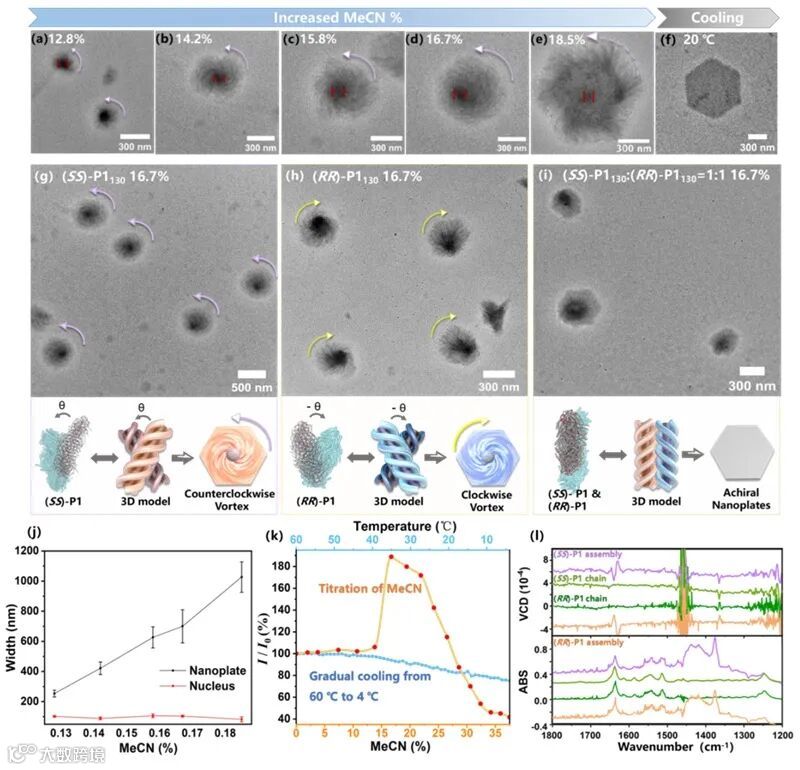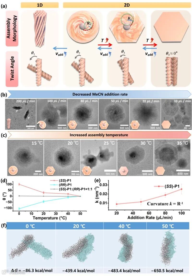 分子手性决定了链间扭曲角的方向,而组装条件可以调控扭曲角度的绝对值大小。通过改变不良溶剂滴加速率、组装环境温度等动力学参数,可有效调节链间扭曲角的大小,进而实现对组装体涡旋方向、曲率与组装维度的可编程调控(图3)。例如,在35 ℃下 (SS)-P1 倾向于形成热力学稳定的规整六方片层结构,链间扭曲角较小;随着温度下降,分子动力学模拟表明链间扭曲角逐渐增大,对应的 TEM 统计结果显示涡旋曲率增加、六方轮廓逐渐转变成圆形。