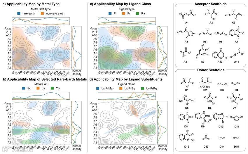 研究团队系统收集并标准化了2007-2023年间的37篇相关文献,构建了包含2176个反应条目的高质量数据集。该数据集不仅涵盖了催化剂结构、反应条件和立体化学结果,还包含了反应性能指标(产率、ee值、dr值)。基于该数据库,团队绘制了金属与配体适用性图谱,揭示了稀土金属与非稀土金属在底物兼容性上的互补关系,以及不同配体骨架(Pi、Pr、Ra)的差异性分布规律,为催化剂设计提供了可视化指引。