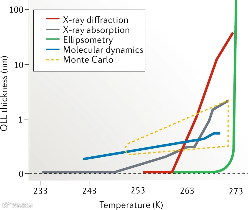 为了研究预熔化现象的起始温度以及预熔水膜的厚度,科学家们采用了多种技术手段。然而,不同实验方法和条件之间的差异,导致所得结果存在明显不一致性。总体而言,预熔化的起始温度被估计在约200 K到260 K之间,而预熔水膜的厚度则大致在1至100 nm之间。
