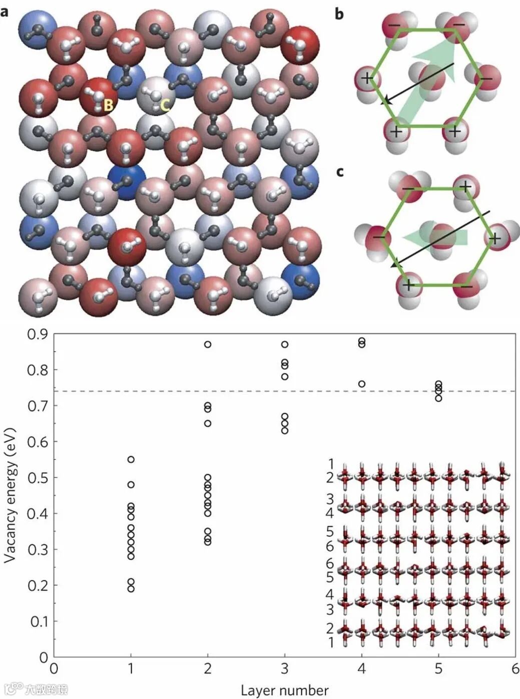 2011年,Watkins等人进行了一项基于密度泛函理论(DFT)的研究,发现了一个颇为出人意料的结论:即使在0 K条件下完美晶体冰表面,其结构也表现出类似无定形的特征 [9]。具体而言,空位形成能的变化幅度可高达约0.7 eV,取决于被移除的水分子是位于表层还是晶体内部。这一结果揭示了冰表面结构在微观尺度上的高度异质性和复杂性。