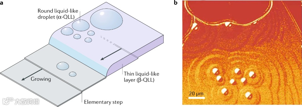 类似地,看似简单的预熔水膜也展现出复杂的相行为。Gen Sazaki教授课题组利用激光共聚焦显微镜和微分干涉对比显微镜联合观察,首次在常压下观察到两种不同的预熔水膜相态:下层为β-QLL,厚度约为9 ± 3 nm(在271.4 K下测量),呈连续润湿状;上层为分散的液滴状α-QLL,润湿性明显低于β-QLL,并且β-QLL与冰的界面相互作用强于α-QLL [10]。目前的观点认为,QLL是一种非均匀且动态的界面结构,由液滴和润湿层共同组成,可以相互转化,存在状态受蒸汽压等外部条件显著影响。