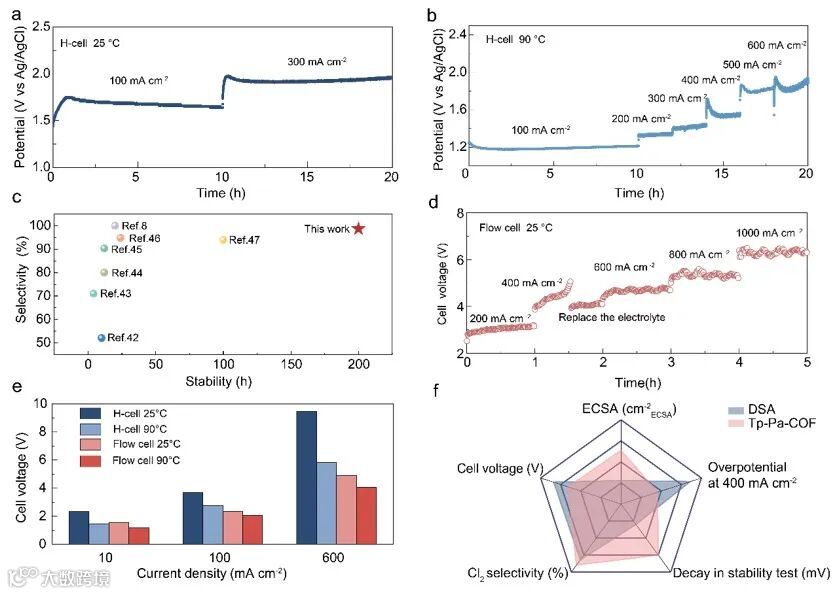 图3. 工业温度条件下Tp-Pa-COF与DSA的电催化析氯性能对比。