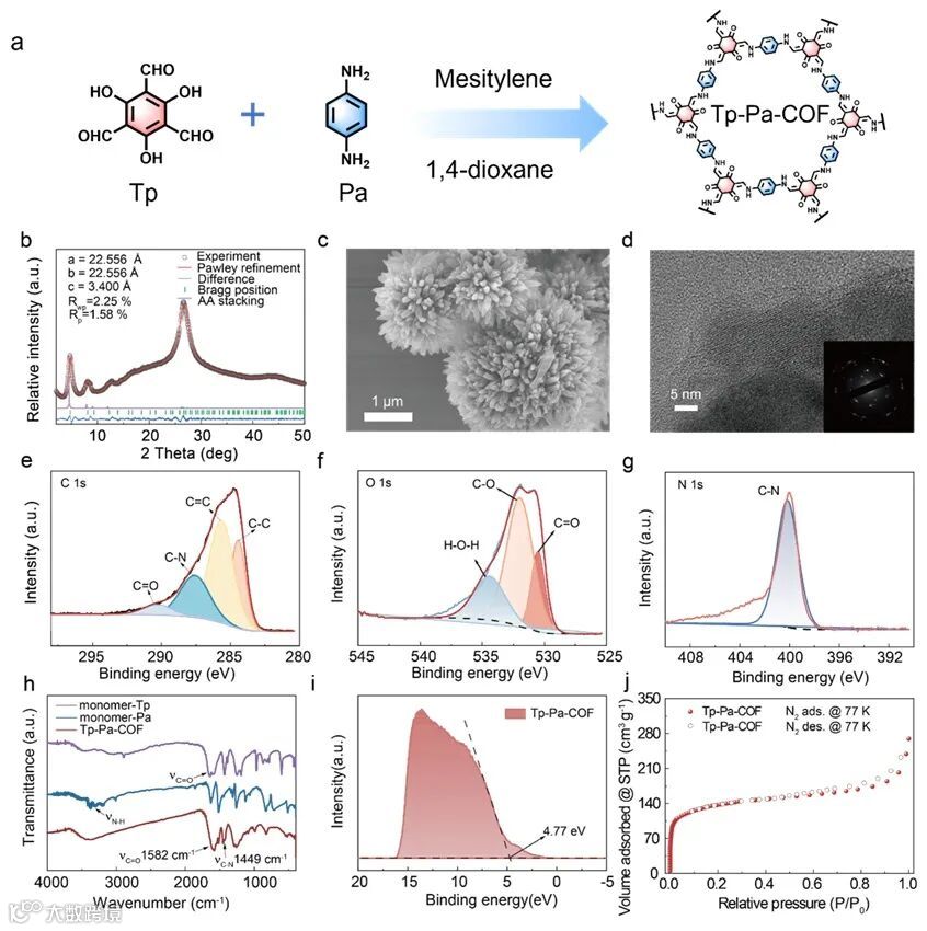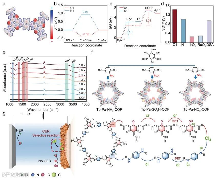氯碱工业是基础化学工业的重要组成部分,析氯反应作为其核心反应长期依赖贵金属催化剂,在实际应用中面临析氧副反应竞争、贵金属资源稀缺、成本高昂以及在强酸环境下易溶解失活等多重挑战。本研究创新性地将高温、强酸下稳定的共价有机框架材料应用于析氯反应。研究结果表明,由三甲酰基间苯三酚和对苯二胺合成的Tp-Pa-COF材料,在90°C、400 mA cm-2的工业级电流密度下,过电位仅为102 mV,性能显著优于商用尺寸稳定阳极(DSA),实现了非金属催化剂在析氯反应中的性能提升,展现出替代贵金属催化剂的潜力。此外,在线差分电化学质谱等多种表征结果证实,该催化剂在宽电位窗口内对氯气的选择性高达100% ± 4%,并具备超过500小时的持续运行稳定性,展现出共价有机框架材料在苛刻电化学环境中的优异耐久性和应用潜力。机理研究进一步揭示,材料中的羰基和仲胺基团作为关键活性位点,能够优先吸附氯离子,从而打破传统析氯反应与析氧反应间之间的竞争限制。这一非金属催化剂的成功开发,为替代贵金属、实现高效低碳的氯气生产提供了新的技术路径。