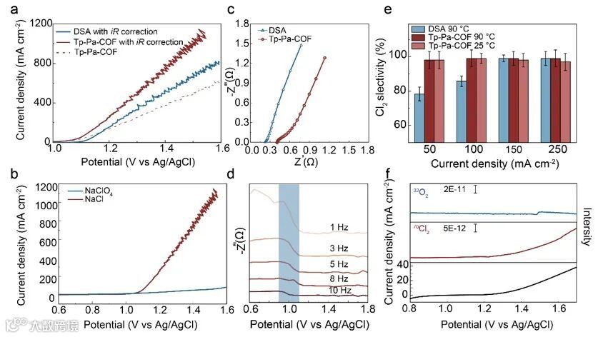 图2. 室温条件下Tp-Pa-COF与DSA的电催化析氯性能对比。