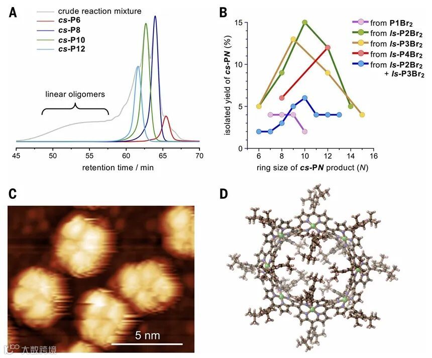随后,作者发现cs-PN的GPC保留时间长于具有相同卟啉单元的线性链,其环状结构首次通过GPC与质谱联用得以确认。如图3A所示,ls-P2OOctBr2环化反应粗混合物的GPC谱图可清晰分离出环状低聚物cs-P6OOct、cs-P8OOct、cs-P10OOct和cs-P12OOct。此外,作者还研究了不同前体的环状低聚物的分离产率与环大小的关系(图3B),结果显示cs-PN低聚物的1H NMR谱信号较少,这表明其为无端基的高度对称环状结构,并且该结论得到扫描隧道显微镜(STM)的证实(图3C),即β-氢原子之间的空间排斥导致单个meso-meso连接的低聚物中相邻卟啉单元发生显著扭曲,因而cs-P8OOct的STM图像呈现四重而非八重对称性。值得一提的是,作者还通过扩散法得到了cs-P8tBu晶体,X-射线衍射分析显示晶体中包含两个构象相似、但晶体学不同的cs-P8tBu单元(图3D),其中Ni-Ni平均直径为 20.65(0.66)Å,并且大环具有高度扭曲的几何形状,而相邻的卟啉单元几乎正交。相邻卟啉的24原子平面之间的平均角度为 84.4(2.7)°,而卟啉单元与八个镍中心的平均平面之间的角度为 48.6(6.2)°。