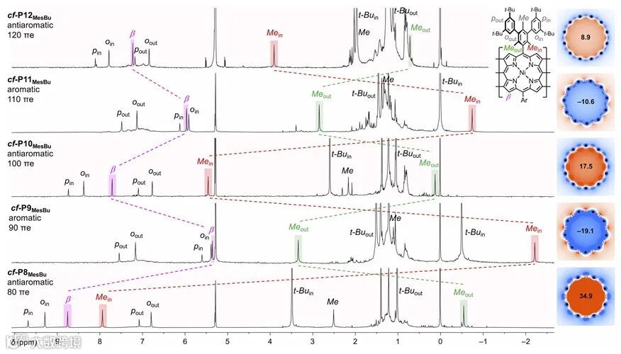 接下来,作者在氯化金(III)和三氟甲磺酸银的条件下将单链环cs-PN成功氧化为三链纳米带cf-PN(产率:95%),其中银盐的作用是抑制生成氯化副产物。如图4所示,该反应的UV-vis-NIR吸收光谱发生了显著变化,并且产物在1500-2000nm处表现出强烈的吸收带。随后,作者采用图2所示的三种芳基(Ar)进行了该反应,结果显示三种反应均观察到相似的UV-vis-NIR光谱;但是仅cf-PNMesBu获得可分辨的1H NMR谱,因此将研究集中于该系列纳米带(N=8-12),同时cf-PNOOct和cf-PNtBu的1H NMR谱宽可归因于芳基基团的动态旋转及其聚集。另一方面,作者结合2D NMR技术对五种cf-PNMesBu纳米带的1H NMR信号进行了归属(图5)。鉴于NOE效应无法区分朝向纳米带内侧(Mein)或外侧(Meout)的均三甲苯基,因此作者假设受环电流屏蔽或去屏蔽最强的信号为Mein,而且实验与DFT计算化学位移之间的良好相关性证实了这一假设。事实上,1H NMR谱显示Mein、Meout和β质子的化学位移随着奇偶数卟啉单元交替变化,进而表明cf-P9MesBu和cf-P11MesBu整体呈芳香性,而cf-P8MesBu、cf-P10MesBu和cf-P12MesBu整体呈反芳香性,这不仅与预测结果相一致,而且与图5右侧的核独立化学位移(NICS)图相符。另外,基于实验测得的Mein和Meout化学位移,利用Biot-Savart定律估算出N=8-12纳米带的环电流磁化率分别为41.9、-29.8、31.3、-20.0和17.2 nA•T-1(苯为-11.8 nA•T-1)。SYSMOIC计算显示cf-P8和cf-P9中的积分键电流与Biot-Savart分析结果相近,约90%电流经由Cmeso-Cmeso键,与相应锌配合物的预测相一致。