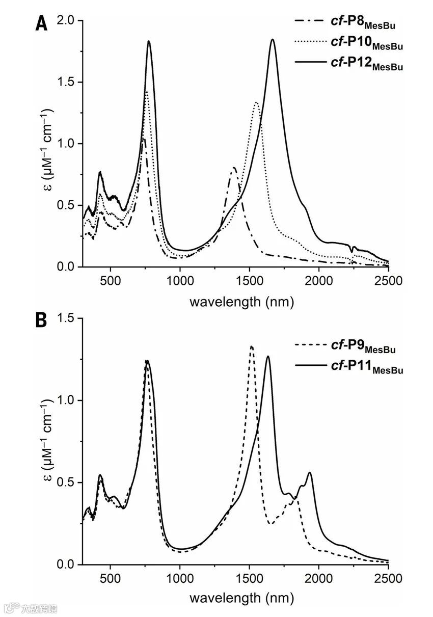 通常情况下,芳香族化合物的UV-vis-NIR吸收光谱具有尖锐而强的吸收带,而反芳香族化合物则往往更宽并延伸至NIR区。在cf-P8MesBu至cf-P12MesBu系列中,纳米带的整体吸收光谱差异不显著,但是NIR区域呈现奇偶交替特征:芳香族纳米带cf-P9MesBu和cf-P11MesBu在1700-1900 nm处显示尖锐肩峰,而反芳香族纳米带cf-P8MesBu、cf-P10MesBu和cf-P12MesBu则无此特征(图4)。