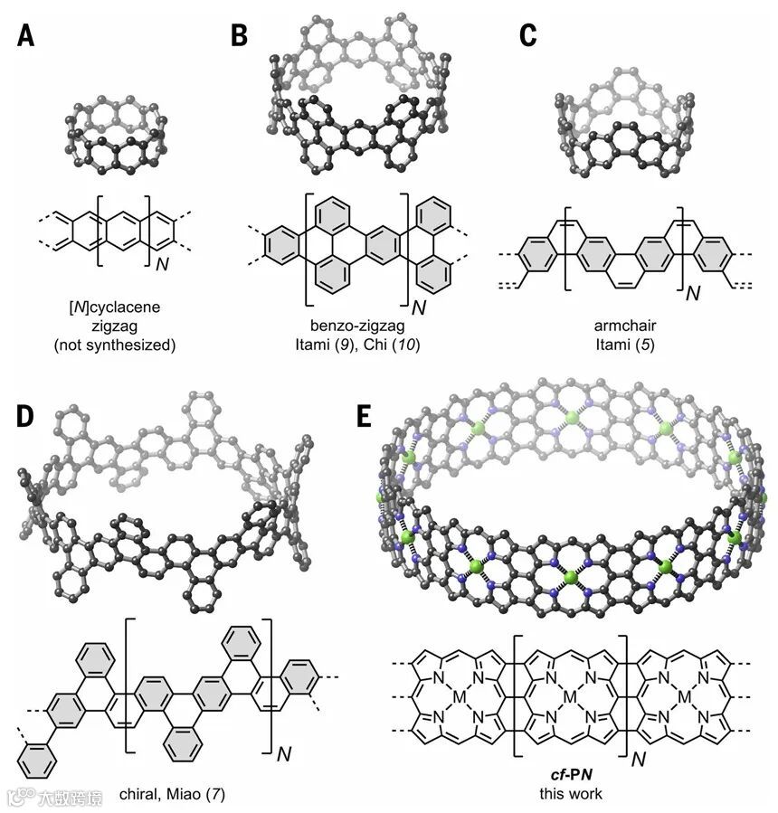 单壁碳纳米管按照卷曲结构可分为扶手椅型、锯齿型和手性型,其中极短且被氢封端的纳米管被称为碳纳米带。长期以来,苯型纳米带由于具有高张力和高反应活性,相关合成尝试屡屡以失败告终。近年来,化学家不仅开发了多种合成苯型纳米带的方法,还探索了它们在光电子材料和超分子识别主体等方面的应用潜力。如图1A所示,最简单的苯型纳米带是由 [n]cyclacenes组成的,但因其开壳层单重态双自由基特性而难以分离,并且目前仅通过质谱法检测到。利用边缘稠合额外苯环可抑制其双自由基特性,使π系统中每个碳原子均参与克拉尔六元环(图1B)。另一方面,分子纳米带的关键性质在于电子的高度离域化,进而使电子波函数类似于量子环中的粒子。然而,现有报道的苯型纳米带(图1C、D)多以富含克拉尔六元环的结构为目标,虽提升了化学稳定性,却削弱了电子离域化。事实上,由六元环构成的苯型纳米带均为交替烃;引入五元环则形成非交替结构,并有助于增强电子离域化。