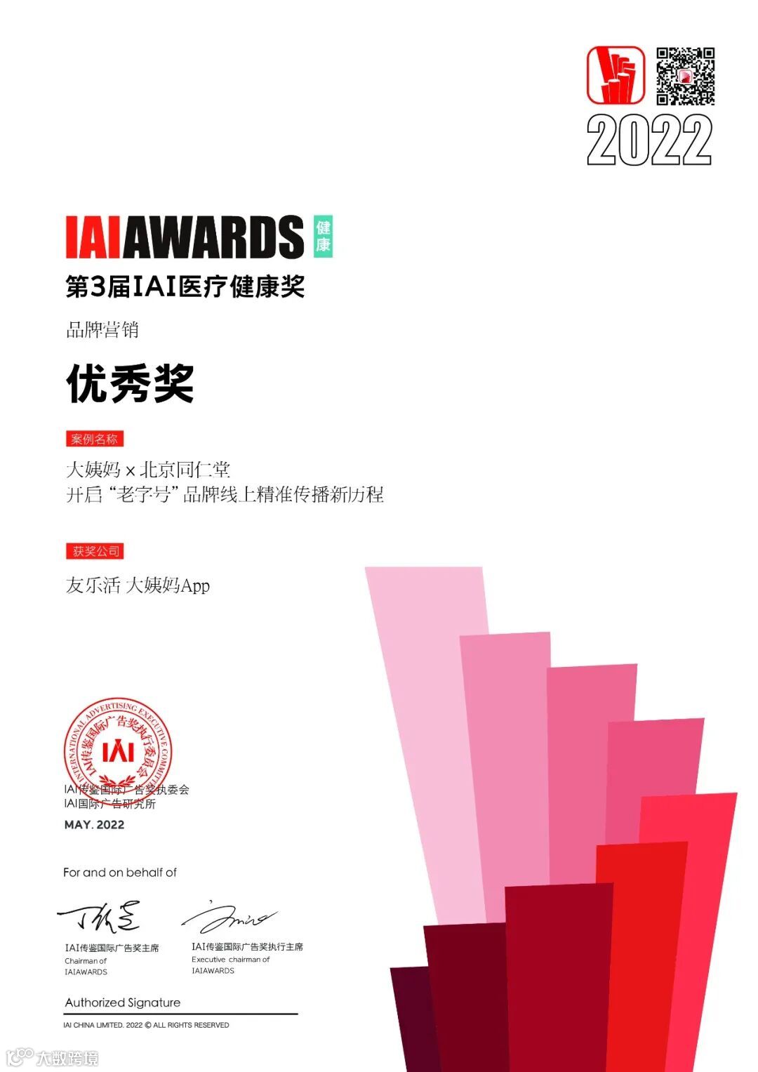 再次感谢IAIAWARDS给到大姨妈App的如此殊荣。此次获奖,不仅是业界对大姨妈App在医疗健康类创意和内容营销领域的再次肯定,更是对大姨妈App在整合老品牌+新平台营销、精准人群传播、内容创新创意等方面的认可。