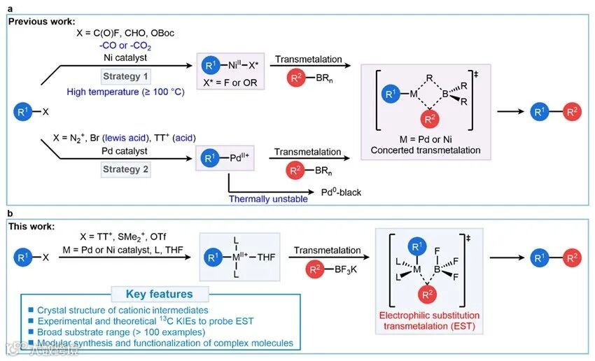 针对这一挑战,天津大学/中国科学院大学黄辉、中国科学院大学史钦钦团队与美国加州大学洛杉矶分校(UCLA)的Kendall N. Houk团队合作,提出了一种基于亲电取代转金属(Electrophilic Substitution Transmetalation, EST)机理的通用无碱SMC反应。该策略利用芳基亲电试剂(Ar-X, X = TT+, Sme2+, OTf)氧化加成生成稳定的阳离子中间体[Ar–MII–L2]⁺(M = Pd 或 Ni),随后通过亲电取代而非传统四元环过渡态实现转金属化,避免了碱的使用,显著提升了底物兼容性(图1)。