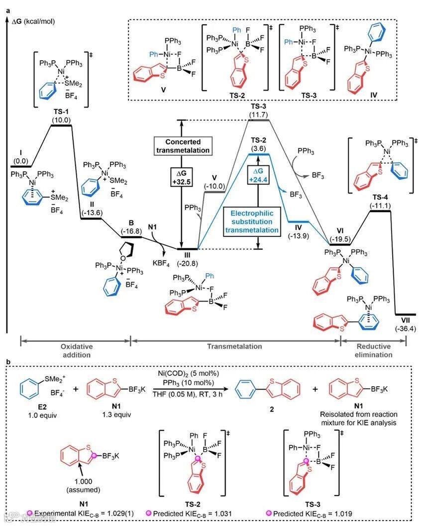 作者以噻蒽硫盐(E1)、二甲基硫盐(E2)和三氟甲磺酸酯(E3)为亲电试剂,苯并噻吩-2-基三氟硼酸钾(N1)为亲核试剂,系统考察了金属催化剂(Pd/Ni)、配体(AsPh3、PPh3等)及溶剂的影响,最终确立最优条件。为了阐明反应机理,研究团队成功分离并表征了两个关键阳离子中间体(钯阳离子中间体A和镍阳离子中间体B),这些中间体表现出优异的稳定性,在室温条件下储存100天后仍保持完整结构。DFT计算表明,镍阳离子中间体B与亲核试剂N1通过亲电取代转金属化过渡态(TS-2)的能垒为24.4 kcal/mol,显著低于传统协同四元环过渡态(TS-3)的32.5 kcal/mol,解释了室温条件下反应的高效性。同时,13C动力学同位素效应(13C KIEs)实验测得KIEC-B值为1.029,EST机理的理论预测值(1.031)高度吻合,而与协同机理的预测值(1.019)存在显著差异(图2)。