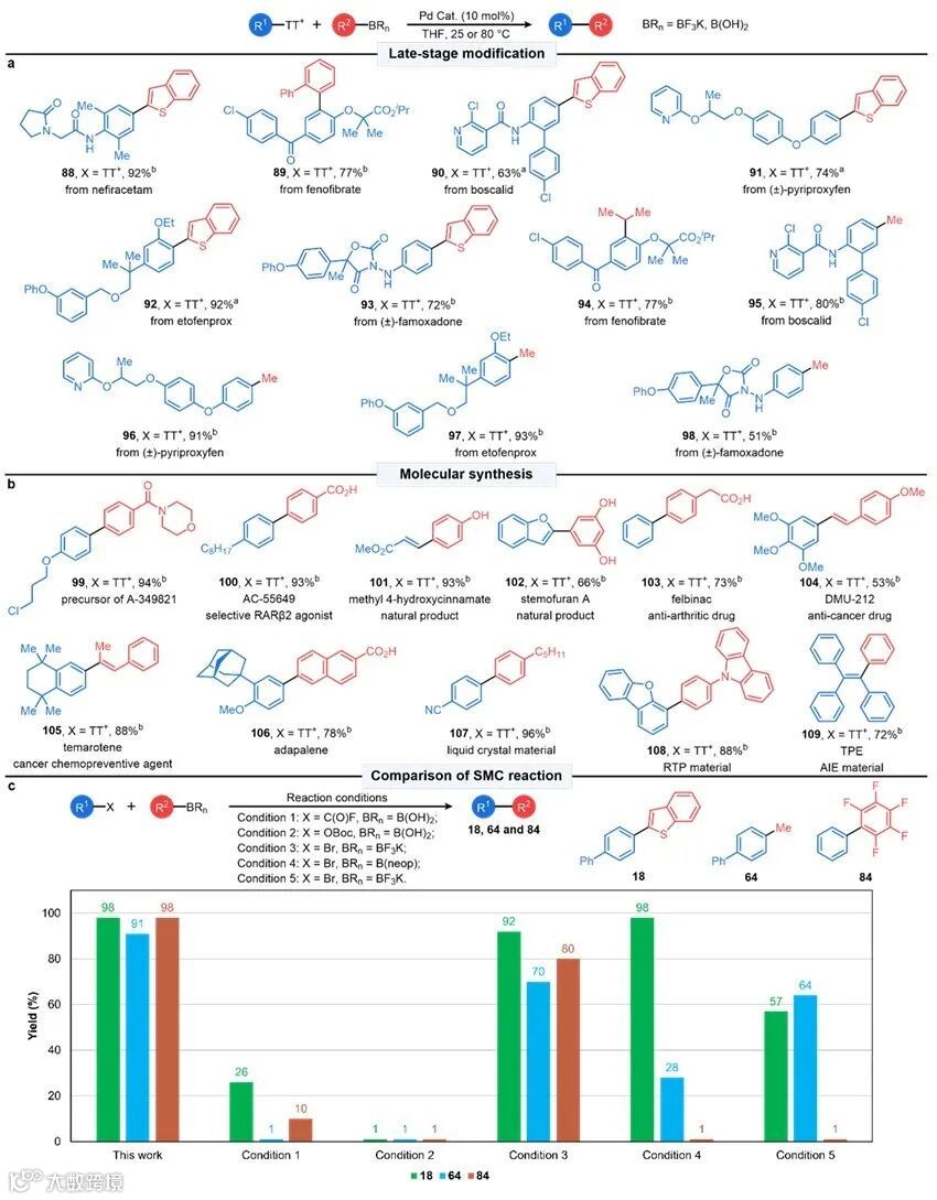 本研究系统考察了超过100种不同结构的底物组合,充分证明了该反应体系的普适性。其中亲电单体涵盖芳基TT盐、芳基二甲基锍盐、芳基三氟甲磺酸酯等多种类型,兼容酯基、氰基、醛基、酮基、酰胺基、酚羟基、卤素以及烯炔等传统碱敏感官能团;亲核试剂包括芳基、杂芳基、烯基、炔基、一级及二级烷基三氟硼酸钾或硼酸。该方法在药物分子修饰以及复杂分子构建中展现出卓越的应用价值(图3),包括降脂药 fenofibrate、杀虫剂 pyriproxyfen、杀菌剂 boscalid 等十余种市售药物,以及天然产物 stemofuran A、抗癌药 DMU-212、A-349821 前体、TPE 类聚集诱导发光(AIE)材料。更重要的是,与目前文献报道的方法相比,本方法在反应效率和底物普适性方面均展现出明显优势。这些应用实例充分证明了该反应体系在药物研发和功能材料合成中的实用价值。