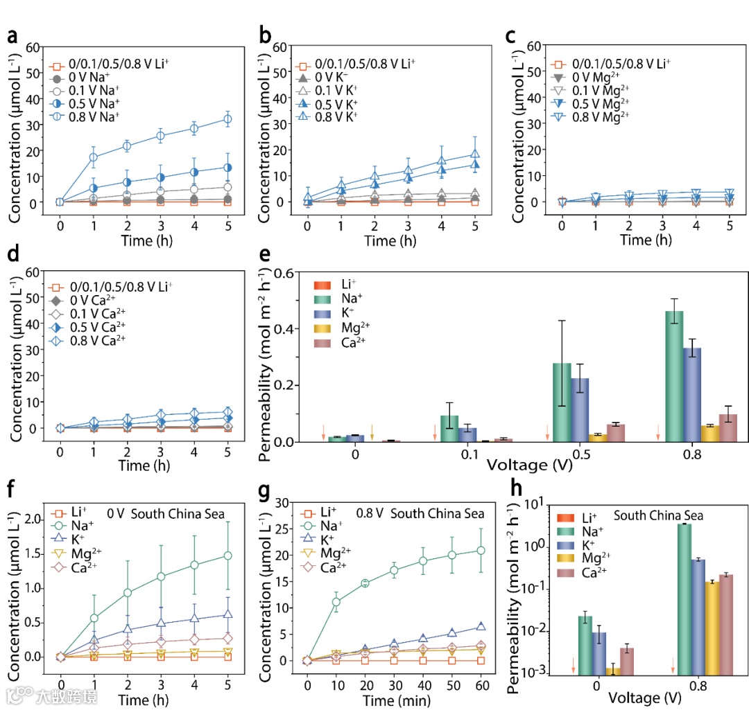 如图4所示,研究团队通过真实海水和盐湖水体系测试,验证了MHOPF膜的应用潜力。此外,在使用MHOPF膜进行电渗析实验时,低电压提升了其他竞争离子的渗透性,仍对锂离子实现几乎完美截留,展示了该膜材料在锂提取技术中的应用潜力。