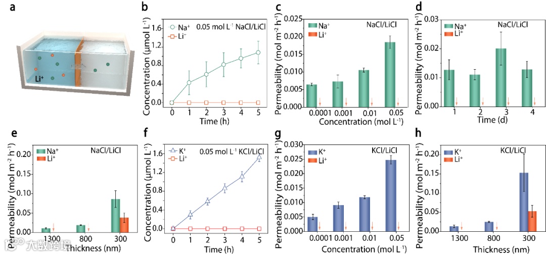 通过密度泛函理论(DFT)计算,研究人员揭示了该膜选择性运输的机制(图3)。框架中的卟吩腔体与锂离子有着强烈的相互作用,导致其在穿越卟吩腔体时,需要克服较高的能量势垒,难以实现跨膜传输。相比之下,钾离子和钠离子与卟吩腔体的相互作用较弱,其穿越卟吩腔体的过程所面临的能量势垒也相对较低,因此能够不断穿越卟吩腔体,最终实现跨膜运输。这种由离子与卟吩腔体相互作用能差所决定的能量势垒,是该膜能够实现几乎完美选择性反向提锂的关键物理基础。