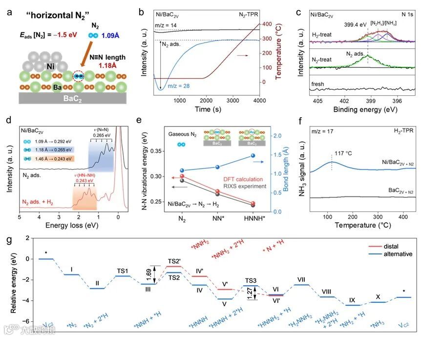 在证明了缺陷结构和电子性质之后,作者对CLAS过程进行了表征。在N2吸附阶段,通过N2-TPR(图4b)对有C2缺陷的Ni/BaC2催化剂进行N2吸附实验,观察到N2在室温下自发地吸附在催化剂表面,通过DFT计算(图4a)可得N2接收C2缺陷位点电子从而被吸附活化,吸附能为-1.5 eV,并通过XPS(图4c中)观察到在399.4 eV处产生一个明显的吸附N2的信号,RIXS(图4d黑线)也观察到了振转能级间隔为0.265 eV与吸附态N2相关的一组特征峰,并通过DFT计算(图4e)对应了“水平氮”的吸附构型。在H2通入后,XPS(图4c上)观察到与氮氢化物相关的信号,并通过RIXS(图4d红线)和DFT计算(图4e),验证了这个信号来自主要中间体*HNNH,证实了加氢过程由交替加氢的缔合路径进行。根据反应能垒计算结果可知,交替加氢路径的最高能垒为*HNNH向*HNNH2的形成(图4g),和主要中间体*HNNH相对应,优于一端加氢的反应路径(最高能垒为1.69 eV)。最后作者通过H2-TPR对比实验证明了负载Ni对H2的活化作用(图4f)。