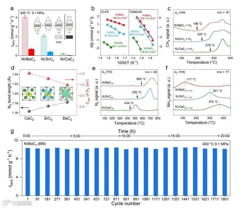 研究表明通过C2缺陷位点的电子转移可以活化N2,为了强化C2缺陷位点对反应的影响,作者设计并制备了一系列碱土金属碳化物(Ni/AeC2)催化剂并进行了性能测试。在400 °C和0.1 MPa下,CLAS相较常规热催化产氨速率均有不同程度的提升(图5a),表现活化能也对应降低(图5b),体现了C2大尺寸缺陷与CLAS的适配性,并通过H2-TPR(图5c)确认了C2缺陷的形成。随后作者通过N2-TPD(图5e)验证了N2与不同种类C2缺陷之间相互作用的强弱关系,并用DFT计算(图5d)证明电子转移影响N2在C2缺陷中的活化程度,最后使用H2-TPR(图5f)温度对比进一步证实。20个小时循环显示Ni/BaC2(BM)催化剂保持强循环稳定性,通过表面反应规避了连续催化过程中相变材料带来的不利影响。