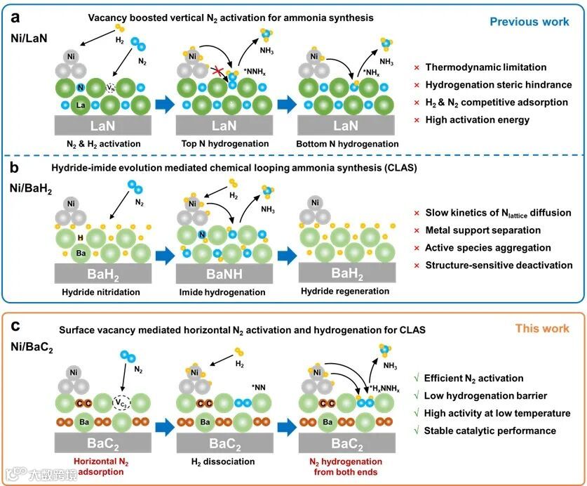 基于此,上海交通大学叶天南团队创新性地提出了缺陷位点活化氮气(N2)与化学链循环合成氨(CLAS)工艺相结合的策略,巧妙利用大尺寸C2缺陷实现对N2分子的水平吸附,显著增强了N2分子的吸附活化;而负载过渡金属Ni则用于活化H2分子,使其溢流至缺陷位点,促进N2分子以缔合机制交替加氢,大幅降低反应能垒。同时结合CLAS工艺,将N2和H2供给分离,并通过CLAS循环实现C2缺陷的持续再生,打破了传统热催化合成氨过程中的热力学平衡限制,极大地提高了低温下的产氨效率。实验结果表明,利用CLAS工艺,富含大尺寸C2缺陷的Ni/BaC2催化剂在低至常压100 °C的温和条件下产氨速率达到0.20 mmol g-1 h-1,远超其他报道的催化剂,常压下氢化反应活化能也低至28.5 kJ mol-1,为开发绿色高效合成氨催化体系提供了一种新的思路。