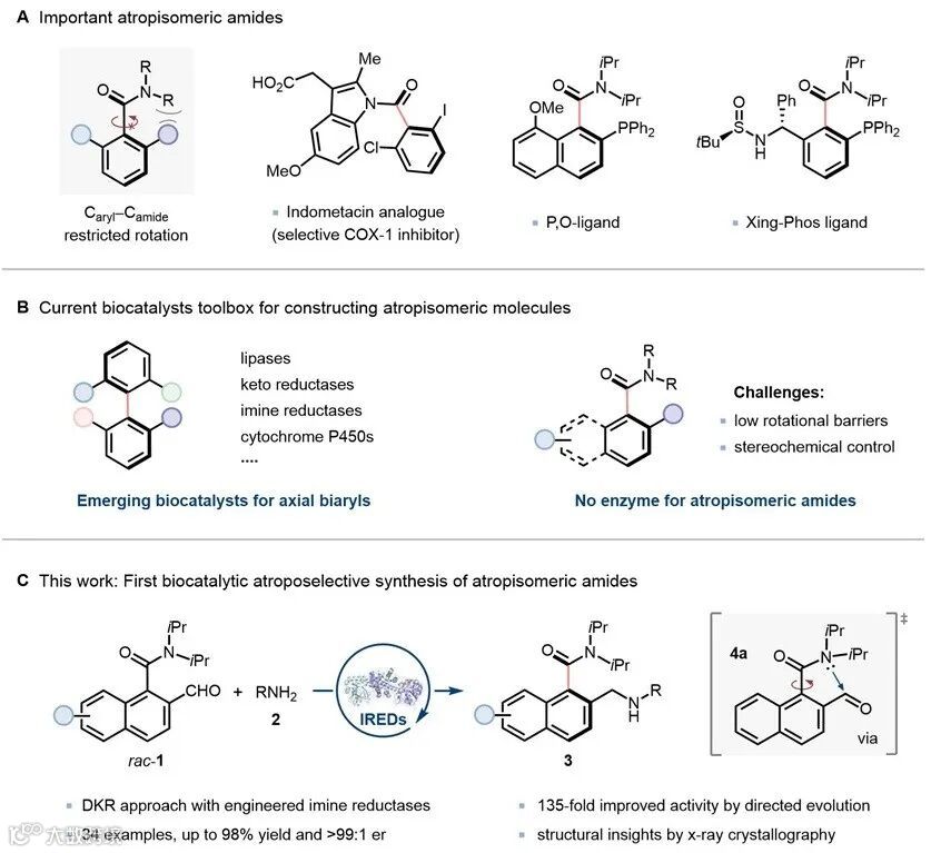 近年来,生物催化在构建轴手性分子领域取得显著进展,多种酶催化剂—从传统脂肪酶、酮还原酶到亚胺还原酶、烯烃还原酶、细胞色素P450乃至人工金属酶—已被成功应用于轴手性分子的不对称合成。然而,现有研究多集中于经典的联芳基骨架体系,针对轴手性酰胺的酶催化构建方法仍无报道(图1B)。
