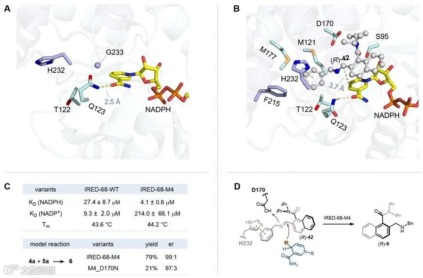 最后,作者结合X射线晶体学与分子对接分析,揭示了IRED-68-M4突变体催化性能提升的机制。研究发现,突变位点V123Q可与还原型辅因子NADPH的烟酰胺环形成额外氢键,从而可能增强与辅因子的结合能力。ITC结合实验进一步证实,突变体IRED-68-M4对NADPH的结合能力显著高于野生型IRED-68-WT(KD = 4.1 μM vs. 27.4 μM)。分子对接结果表明,V232H位点可与亚胺底物42的苯环产生π–π相互作用,而S233G位点则扩大了活性中心空腔,有利于大体积底物的结合与进入。此外,通过单位点突变实验,作者鉴定出D170为潜在的质子给体(图4)。